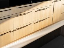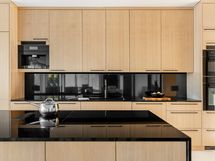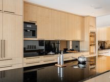 - Poikkeuksellisen tyylikäs puusepällä mittatilauksena teetetty tammikeittiö, jossa on runsaasti säilytys- ja laskutilaa. Keittiö yhdistyy hienosti suuren saarekkeen yli olohuoneeseen ja ruokailutilaan. Mustat graniittitasot sopivat täydellisesti kokonaisuuteen.