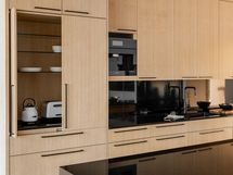 Keittiö on kattavasti koneellistettu laadukkain Mielen keittiökonein mm. integroitu kahvikone, tasoliesi integroidulla liesituulettimella, höyryuuni jne. Kylmäkalusteet ja viinikaappi ovat Festivon mallistoa.