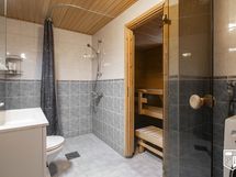 - Kuvaus: Seinät paneloitu, lattia laatoitettu. Sähkökiuas. Ikkuna.