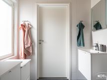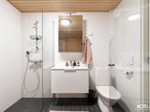 - Pesutilojen kuvaus: Alakerrassa ikkunallinen kylpyhuone, jonka seinät ja lattia ovat laattaa. Suihkuseinä, suihku, peili, allaskaappi, wc-istuin ja bidee suihku. Pesukoneliitäntä ja vesikiertoinen lattialämmitys.