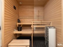 - Moderni lasiseinäinen sauna, jossa lattia on laattaa ja seinät ja katto paneelia. Pilarikiuas.