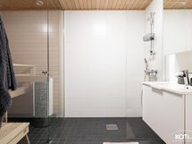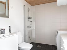 Yläkerran kylpyhuoneessa seinät ja lattia laattaa. Kaartuvat suihkuseinät, suihku, peili- ja allaskaappi, wc-istuin, bideesuihku ja vesikiertoinen lattialämmitys. Yläkerran kylpyhuoneen yhteydessä moderni sauna.