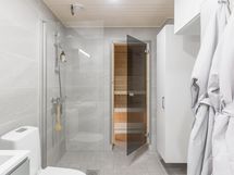 Keraaminen laatta seinissä ja lattiassa, katossa valkolakattu kuusipaneeli ja kattoon upotetut led-valaisimet. Harmaarunkoiset peili- ja allaskalusteet, valkoinen pyykkikaappi. Asunnossa on kylpyhuoneen lisäksi erillinen wc.