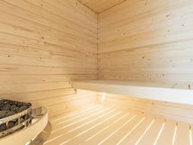 Seinässä ja katossa kuusipaneeli, lattiassa keraaminen laatta. Lauteet ja kiukaan suojakaide haapaa. Valaisin alalauteen alla. Lauteeseen upotettu kiuas erillisellä ohjaimella. Saunan ovi pronssilasia, pyöreä puinen vedin.
