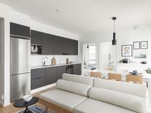 Sisustusvalinnoilla on haluttu vielä korostaa tätä ajatonta ja modernia asuntopohjaa. Parkettilattia on Cream Oak Lively, keittotilan Graphite Gray, tummanharmaa ja laminaattitaso Crystal Marble muodostavat harmonisen kokonaisuuden. Kosteissa tiloissa seinissä on Burlington Matt ja lattiassa More Sea. Ihastuttava kokonaisuus!
