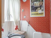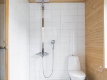 - Pesutilojen kuvaus: Kylpyhuoneessa on lattialämmitys, wc-istuin ja sadesuihku. Erillisen WC:n kuvaus: Wc:ssä on allas ja wc-istuin.
