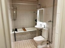 - Suihku, Kylpyamme, Pesukonevalmius, Peilikaappi, Halogeenivalot, Laattaseinä, Laattalattia,