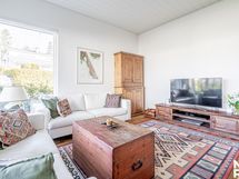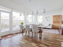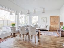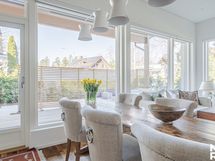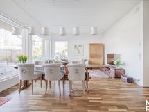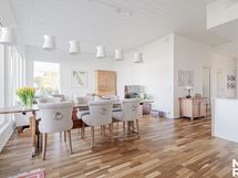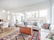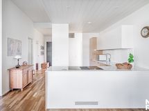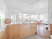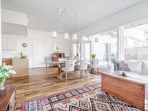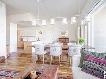 Sisääntulo aulasta tila jatkuu avarana ja valoisana avokeittiön, ruokailutilan ja olohuoneen viihtyisänä kokonaisuutena.