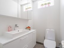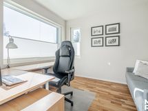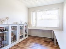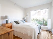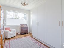 Päämakuuhuone, isolla vaatehuoneella on omassa rauhassa oleskelupihan puolella. Kolme muuta makuuhuonetta sijoittuvat etupihan suuntaa. Kaikki makuuhuoneet ovat hyvän kokoisia. Kodinhoitohuoneesta on käynti pikkuvessaan, autokatokseen ja saunatiloihin.