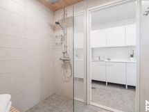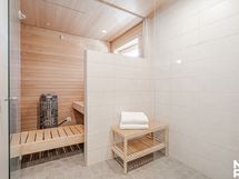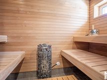Pesuhuoneessa on sadesuihku ja saunan puolella vastakkaiset lauteet, ikkuna ja sähkökiuas.