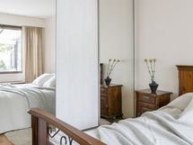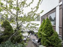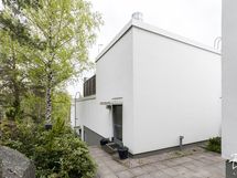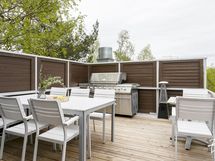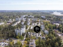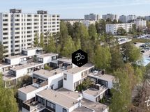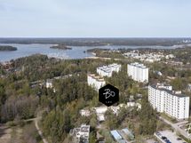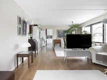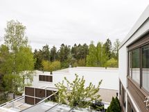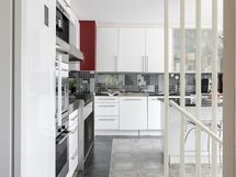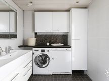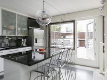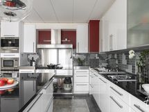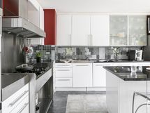 - Valkoiset korkeakiiltoiset kaapistot, mustat kivitasot, muhkea Miele Cooktop, jossa on 2 kaasupoltinta + wokkipannu poltin + 2 induktiokeittotasoa + laavakivigrilli + liesituuletin koko leveydeltä. Bosch kivitasoon upotettu yleiskone, Miele astianpesukone 2017, Fisher & Paykel leveä jääkaappipakastin 2018, jossa juomavesiautomaatti ja jääpala-automatiikka, lisäksi Samsung jääkaappi 2018, Siemens kalusteuuni, Siemens mikro, Miele astianlämmitin 2017, Miele kapselikäyttöinen kahvikone 2017. Saareke, jossa vetolaatikot ja kivitaso. Laminaattilattia 2005. Keittiöstä käynti kattoterassille.