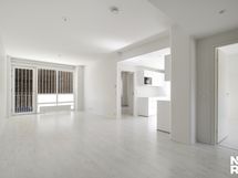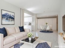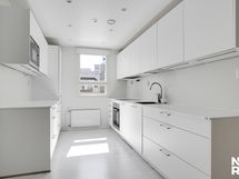 - Keittiö: Jääkaappi-pakastin, erillisuuni, induktioliesi, integroidut mikroaaltouuni ja astianpesukone, liesituuletin, tiskiallas, välitila maalattu, led-valaisimet katossa ja välitilassa, rullaverho, tasot laminaattia. Seinät maalattu ja lattia laminaattia.