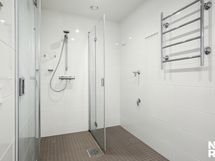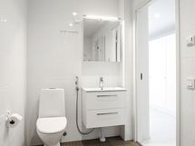 - Pesutilojen kuvaus: Kylpyhuone/wc: Suihku, suihkuseinät, lavuaari, peilikaappi, lavuaarilaatikosto, bideesuihku ja wc-istuin, pesukoneliitäntä, paikka pesutornille, lattialämmitys, seinät kaakelia ja lattia laattaa.