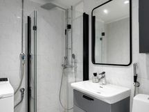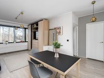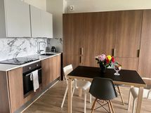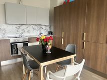 - Keittiön varusteet: Jääkaappipakastin (Integroitu), liesituuletin (Aktiivihiili), liesi, erillisuuni ja astianpesukone. Liesi: Induktioliesi. Työtason materiaali: Kvartsikomposiitti. Keittiö uusittu 2025.