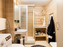 - Pesutilojen kuvaus: Suihkukaappi, pyyhepatteri, allas, peili, wc-istuin, bideesuihku, pesukoneliitäntä. Seinät ja lattia laattaa.