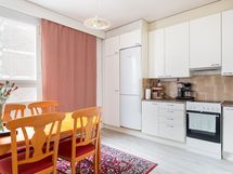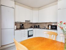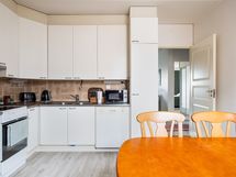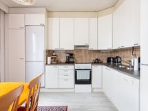 - Jääkaappi/pakastin, uuni, liesi, liesituuletin, astianpesukone. Seinät maali, välitila laatta, lattia laminaatti.