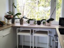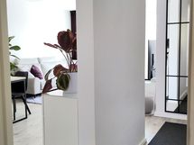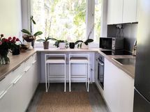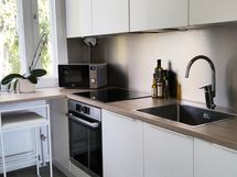 Varustus: Integroidut kodinkoneet (Boschin: induktioliesi, AEG:n astianpesukone), Boschin jääkaappi-pakastin, pyrolyysi-kiertoilmauuni ja liesituuletin, suorakaiteen muotoinen tilava lavuaari.