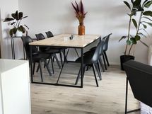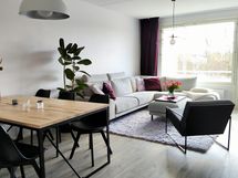 - Alkuvuodesta 2022 remontoitu valoisa ikkunallinen keittiö, jossa hyvin kaappi- ja laskutilaa. Ikkunan ääressä saareke. Topi-Keittiön kaapinovet, välitilassa tyylikäs kultainen levy. Laadukkaat Boschin ja AEG:n kodinkoneet. Lattia vinyylilankku. Olohuoneen yhteydessä olevaan ruokailutilaan mahtuu hyvin 6-8 hlön 180x100 ruokapöytä.