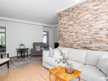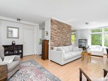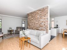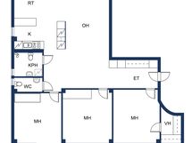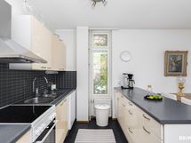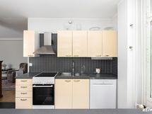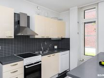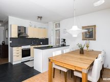 - Tilava avokeittiö jonka varustus: täyskorkeat jääkaappi ja pakastin, keraaminen lattialiesi, liesituuletin, kaapistot, saareke. Laminaattityötasot, laattalattia.
