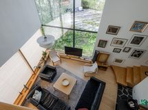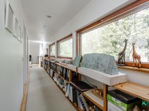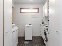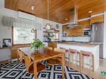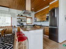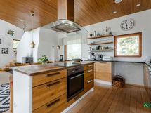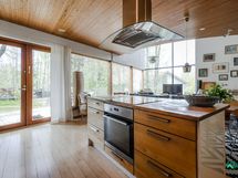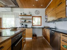 - Isku-keittiökaapistot (ovet umpipuuta, lämpökäsitelty koivu), musta graniittitaso, puutaso, jääkaappi/pakastin (2021), astianpesukone (Miele, 2021), liesi ja uuni (2021), liesituuletin