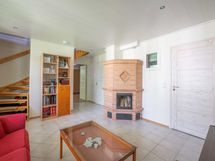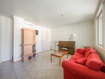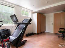 Alakerrassa takkahuone, jossa varaava takka. Alakerrassa lisäksi vaatehuone ja varasto, sekä harrastehuone (pohjakuvassa varasto)