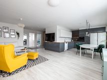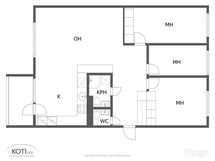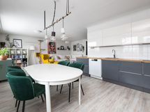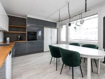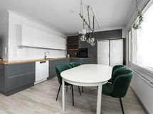 - Runsaat kaapistot, täyskorkea jääkaappi, täyskorkea pakastekaappi, induktioliesi, erillisuuni (uusittu 2019), aktiivihiilisuodatin, astianpesukone, työtasot puuta, seinät maalattu / laatoitus, lattia vinyyli.