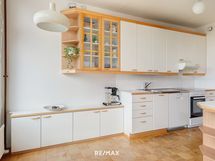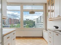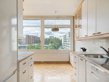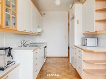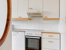 - Keittiön varusteet: Liesi, uuni, liesituuletin, astianpesukone ja jääkaappipakastin. Liesi: Keraaminen liesi. Työtason materiaali: Laminaatti.