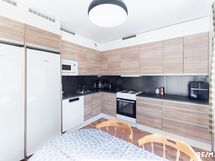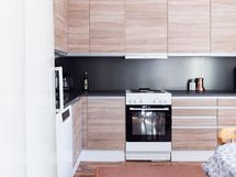 - Keittiön varusteet: Jääkaappi, erillinen pakastin, liesi, uuni, liesituuletin, mikroaaltouuni ja astianpesukone. Liesi: Keraaminen liesi. Työtason materiaali: Laminaatti.