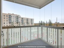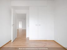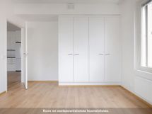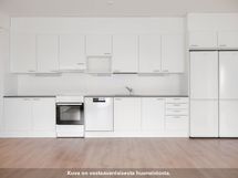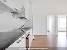 Tähän kulmahuoneistoon tulee valoa kahdesta ilmansuunnasta. Keittiö ja olohuone ovat yhtenäistä tilaa, jonka yhteydessä on myös asunnon lasitettu parveke. Keittiössä on valmiina astianpesukone, keraaminen liesi, kaksi jääkaappipakastinta sekä tilavaraus mikrolle. Makuuhuoneet sijaitsevat asunnon kulmissa, ja niissä on säilytystilaa kaapistoissa.