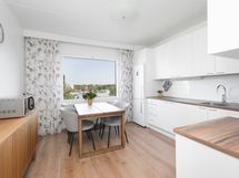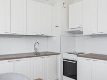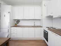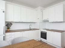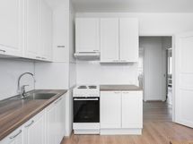 - Keittiön varusteet: Jääkaappipakastin, liesi ja liesituuletin. Liesi: Valurautaliesi. Työtason materiaali: Laminaatti.