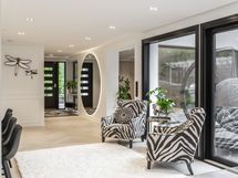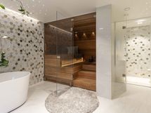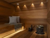 - Kuvaus: Saunassa on lasiseinät, lauteet on magnoliaa, Harvian Cilindro kiuas. Lauteiden alla on epäsuora valaistus, katossa led valot sekä kiuasvalo.