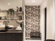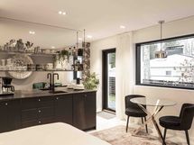 Keittiössä on myös arkea helpottava, suljettava aamiaiskaappi, jossa yläkaapit sekä upotettu mikroaaltouuni, taso ja