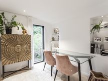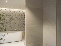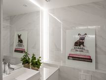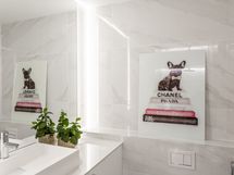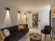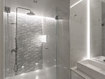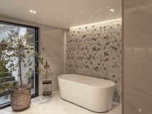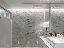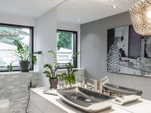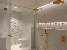 - Pesutilojen kuvaus: Talossa on neljä kylpyhuonetta. Alakerrassa erittäin tyylikäs ja tilava spa-osasto, jossa Tapwellin laadukkaat kullan sävyiset suihkut (2kpl), tunnelmallinen ja himmennettävä valaistus, hohtavat tehostelaatat ja