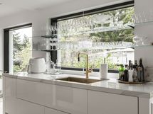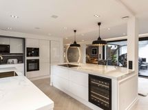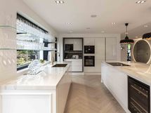 - Keittiösä on Ala Carten kiiltävät valkoiset kaapistot ja ylellinen vaalea Tulikiven korkeakiiltoinen