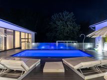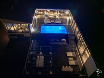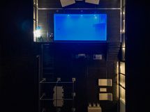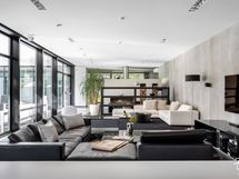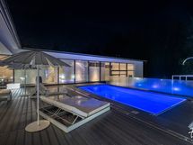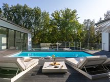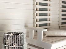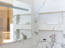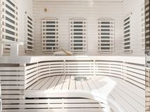 - Kuvaus: Tyylikäs ja tilava sauna sijaitsee asunnon pääkerroksessa. Saunan seinät, lauteet ja katto ovat vaaleaksi käsiteltyä puupaneelia ja lattiat on Dekton-laattaa. Sauna on varustettu sekä sähkökiukaalla, että kahdeksalla infrapunapaneelilla, joita voi käyttää samanaikaisesti normaalin saunan kanssa.