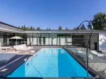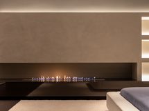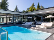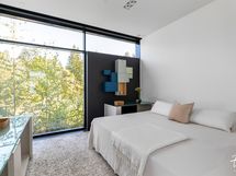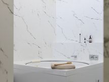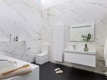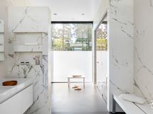 Päämakuuhuoneen yhteydessä on n. 18 m2 kylpyhuone/wc, jossa on suuret 3,0 x 1,4 m Cosentinon Dekton-seinälaatat. Näyttävät lattialaatat ovat Consentinon 1,57 x 1,44 Dekton-laattoja. Tilavassa Kylpyhuoneessa on Duravitin 1,8 metriä halkaisijaltaan oleva Blue Moon poreamme. Näyttävä kylpyhuone on varustettu Hans Grohen Philip Stark X -sarjan tuottein.