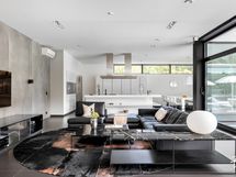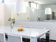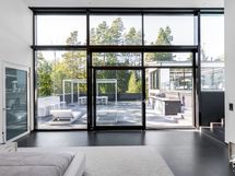 Avokeittiön vieressä saarekkeen toisella puolella on tilava ruokailutila, joka avautuu olohuoneeseen ja terassialueelle.