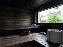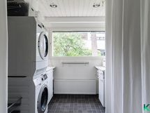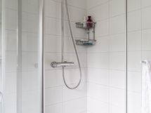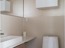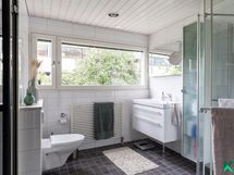 - Kylpyhuone; suihku, suihkukaappi, peili, allaskaapisto, käsienpesuallas, seinä-wc, lattialämmitys, kylpyhuonekaapisto, kiinteät valaisimet. Erillinen wc; käsienpesuallas, seinäkaappi, peili, pidesuihku, wc-istuin, kiinteät valaisimet. Sauna; lattia laatoitettu, seinät ja katto paneloitu, sähkökiuas ja ikkuna.