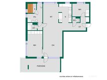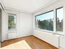 - Ikkunallinen kylpyhuone, jonka varustukseen kuuluu suihku, pesukoneliitäntä, allas, wc-istuin, sauna sähkökiukaalla. Erillinen wc eteisessä.
