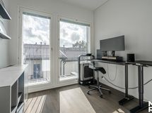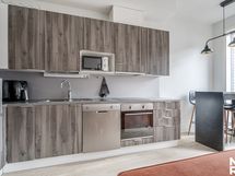 - Keittiö: Jääkaappi-pakastin, erillisuuni, induktioliesi, paikka mikroaaltouunille, liesituuletin, tiskiallas, astianpesukone, välitila levyä, valaisin välitilassa, tasot laminaattia, seinät maalattu ja lattia parkettia.
