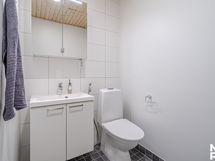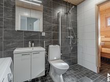 - Pesutilojen kuvaus: Kylpyhuone/wc: Suihku, suihkuseinä, lavuaari, peilikaappi valolla, lavuaarikaappi, bideesuihku, wc-istuin, pesukoneliitäntä, paikka pesutornille, seinät kaakelia, lattia laattaa ja lattialämmitys.