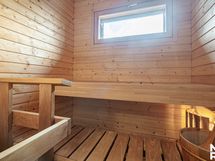 - Kuvaus: Sauna: Sähkökiuas, ikkuna, seinät paneelia ja lattia laattaa.