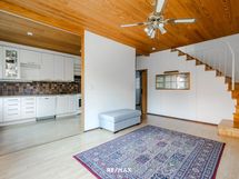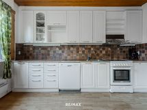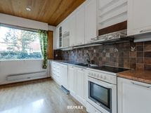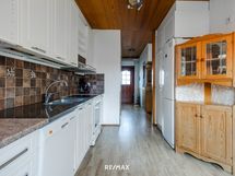 - Keittiö on osittain avoin olohuoneeseen ja sinne sopii mainiosti myös ruokapöytä. Varusteina keittiössä on vaaleat kaapistot, jääkaappi/pakastin, astianpesukone, keraaminen liesi ja uuni sekä liesikupu. Välitila laattaa, lattia laminaatti. Runsaasti kaappitilaa. Katto puuta.