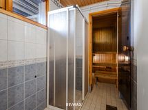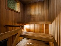 - Kiuas: Sähkökiuas. Ikkunallinen sauna, jossa sähkökiuas. Seinät paneelia, lattia laatta.