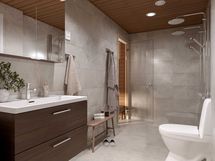 Harmaat eläväkuvioiset laatat. Katossa valkolakattu mäntypaneeli ja kattoon upotetut led-valaisimet. Peilikaappi ja allaskalusteet Svedbergsin. Suihku sekä hana Moran.