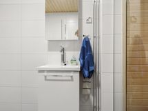 Suihkuseinä, Suihku, Pesukonevalmius, Laattalattia, Laattaseinä, Peilikaappi, Allaskaappi, Lattialämmitys
