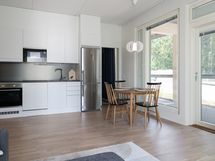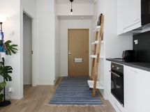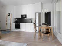Avokeittiö ja olohuone muodostavat avaran oleskelutilan, jossa arjen askareille on mukavasti tilaa. Eri puolilla asuntoa sijaitsevat makuuhuoneet, joista pienempi toimii tarvittaessa hyvin työhuoneenakin.