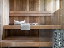 - Kuvaus: Seinät lämpökäsiteltyä radiatamänty-paneelia, lauteet lämpökäsiteltyä haapaa. sähkökiuas