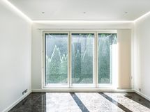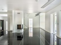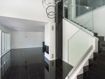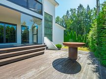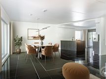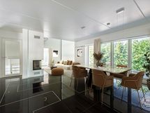 Keittiön ja olohuoneen välissä on ruokailutila, johon mahtuu iso ja näyttävätkin ruokapöytä ja tuolit