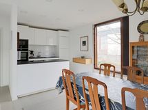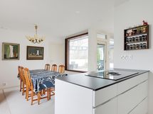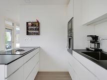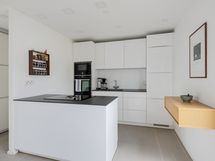 - Keittiön varusteet: Liesi, liesituuletin, astianpesukone, jääkaappipakastin, mikroaaltouuni ja kiinteät valaisimet. Liesi: Induktioliesi. Työtason materiaali: Kivi.